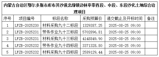 內(nèi)蒙古利凡工程項(xiàng)目管理有限公司受鄂爾多斯市水投惠源建設(shè)有限公司的委托,采用比選的方式,對(duì)內(nèi)蒙古自治區(qū)鄂爾多斯市庫布其沙漠北緣鎖邊林草帶西段、中段、東段沙化土地綜合治理項(xiàng)目--勞務(wù)作業(yè)、材料采購5個(gè)標(biāo)段進(jìn)行采購,歡迎符合資格條件的應(yīng)選人前來參加: