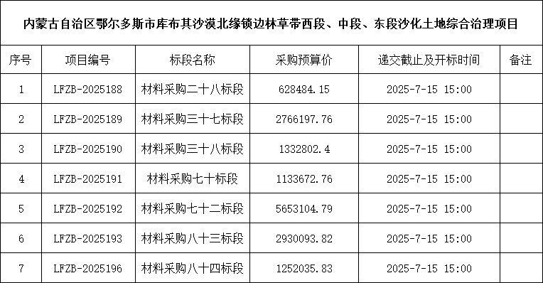 內(nèi)蒙古利凡工程項目管理有限公司受鄂爾多斯市水投惠源建設(shè)有限公司的委托,采用比選的方式,對內(nèi)蒙古自治區(qū)鄂爾多斯市庫布其沙漠北緣鎖邊林草帶西段、中段、東段沙化土地綜合治理項目--材料采購7個標(biāo)段進(jìn)行采購,歡迎符合資格條件的應(yīng)選人前來參加: